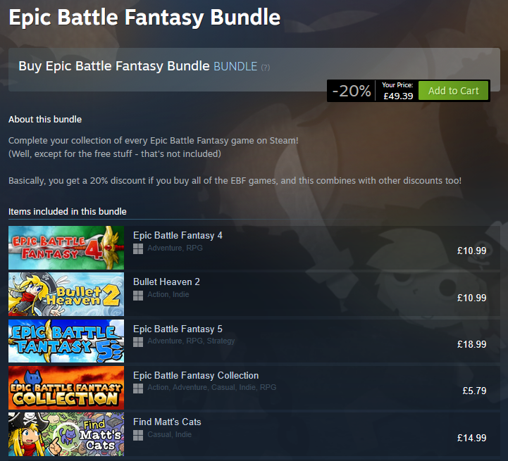 So I added Find Matt’s Cats to the Epic Battle Fantasy Bundle, so you can continue getting 20% off if you’re an EBF fan.