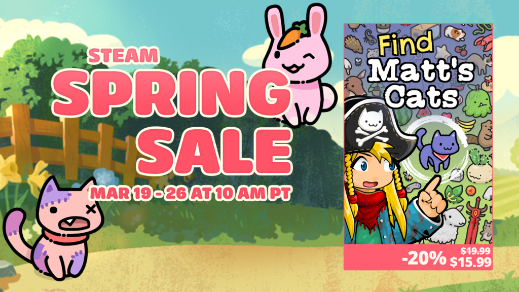 The Steam Spring Sale has started, and you can get our mewly released, certifiably paw-some game Find Matt’s Cats, for a whopping TWENTY percent off right meow! You can also find the EBF Collection for 50% off, EBF5 for 60% off, and EBF4 and BH2 for 70% off until March 26th 10AM Pacific.